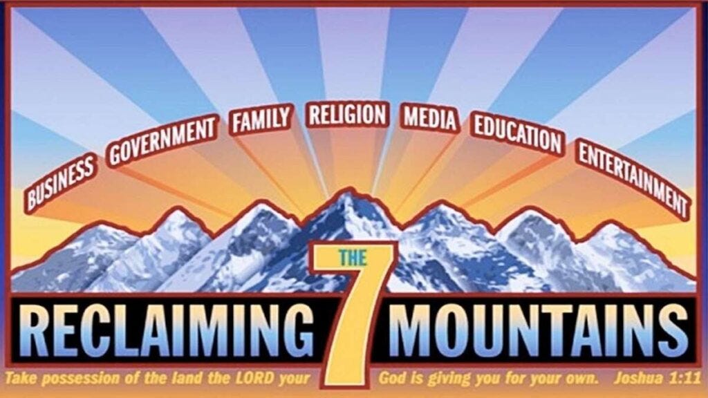 The Seven Mountains Mandate is a teaching promoted within charismatic and evangelical Christian circles that argues Christians should seek leadership or influence over the seven key “mountains” (or sectors) of society: government, education, media, arts and entertainment, business, religion, and family.